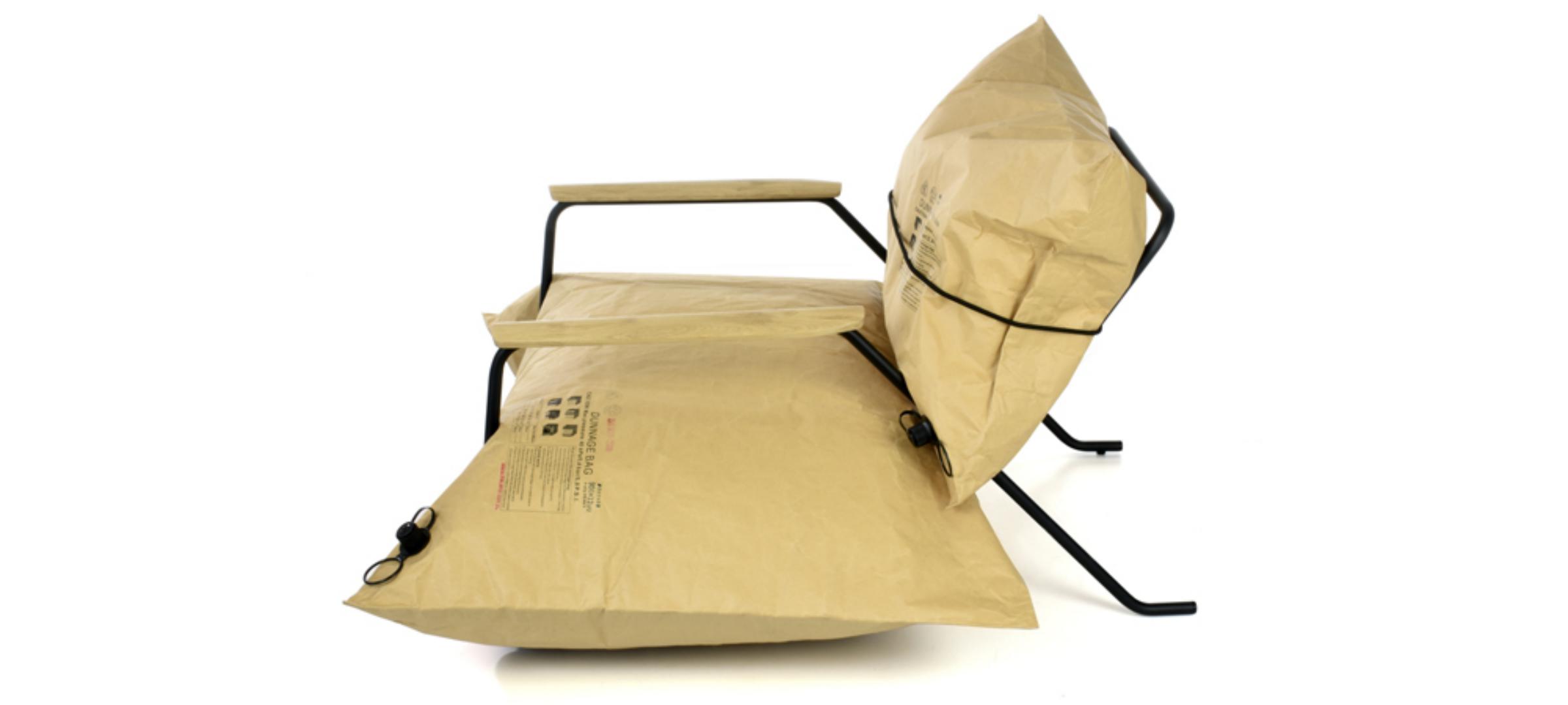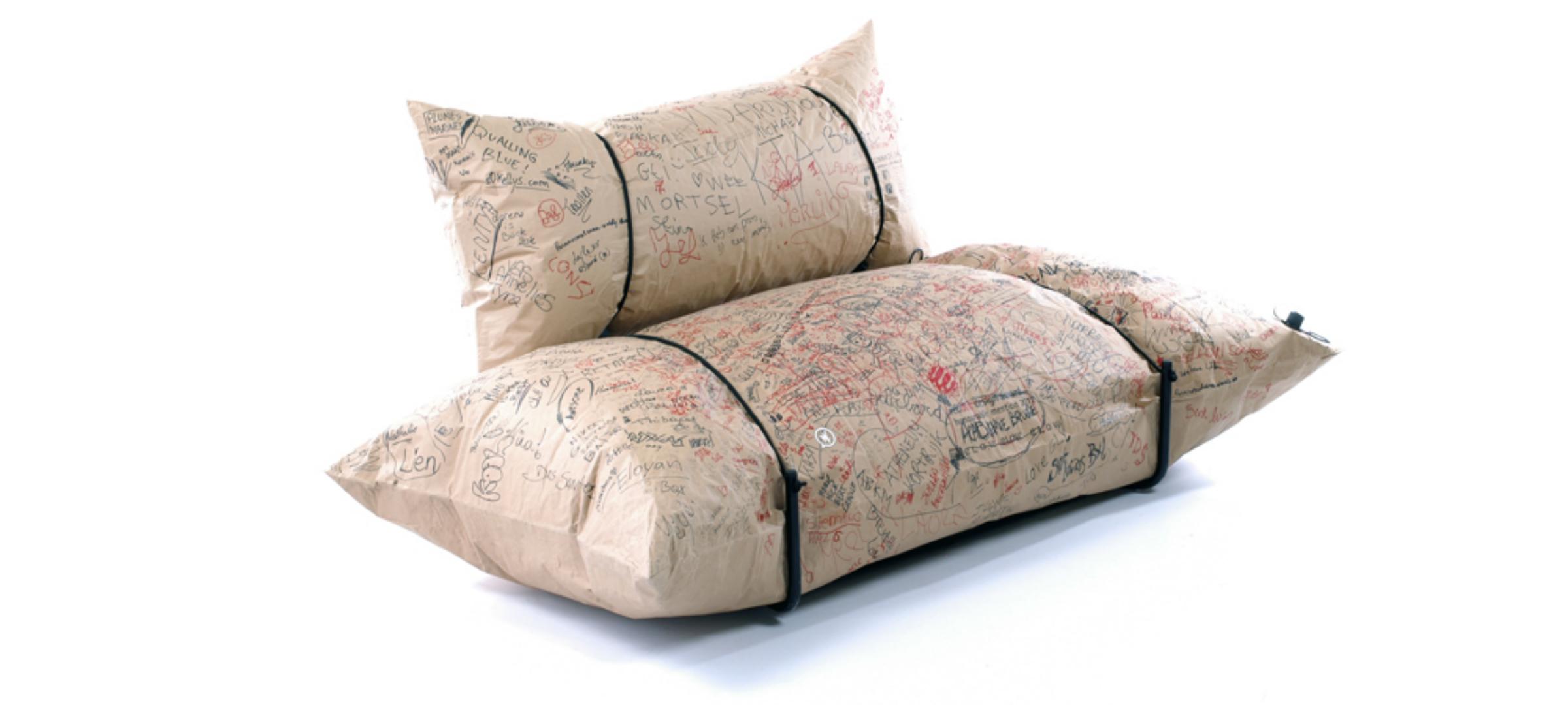Swoje ekologiczne meble z kolekcji papier zrealizowali z użyciem dmuchanych worków papierowych, które wytrzymują 2 tony nacisku. Już wielokrotnie wspominałam, że papier to wyjątkowo silny i wytrzymały materiał, do tego wszechstronny. Worki osadzili na stelażu ze stalowych rurek. W kolekcji znajduje się Blow Sofa, Fotel Recycling, Stołek Recycling. Według twórców kolekcja papier służy do siedzenia – pisanie na nim jest funkcją dodatkową. Choć możliwą ;)