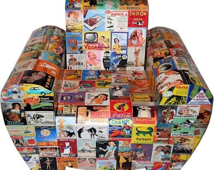 Realizacją Ekocentric Design jest fotel, który w swoim wyglądzie prezentuje styl vintage z racji na wykorzystanie oldschoolowych reklam. To również szafka i stolik z motywem druku.